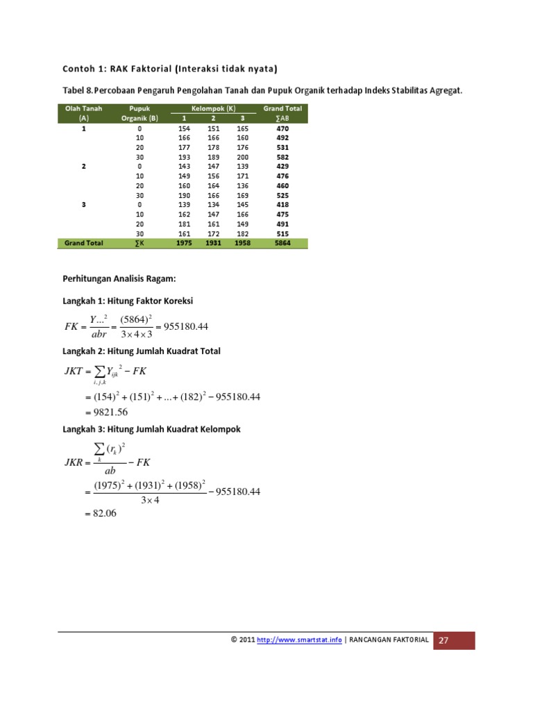 Apabila kita melakukan percobaan pada sebidang tanah yang mempunyai tingkat kesuburan berbeda maka pengaruh perlakuan yang kita anggap berasal dari perlakuan yang kita cobakan bisa saja tidak benar. Pengolahan tanah terdiri dari 3 taraf dan pupuk organik 4 taraf. Contoh rak faktorial langkah langkah dalam penentuan indeks huruf notasi bisa dilihat dalam contoh ral faktorial pada taraf pupuk organik 0 p 0 olah tanah o rata rata 1 4 77 a 2 25 10 b 3 35 17 b pada taraf pupuk organik 20 p 2 olah tanah o rata rata 1 6 035 67 a 2 5 67 a 5 50 3 a pada taraf pupuk organik 10 p 1. Sebagian besar percobaan percobaan yang dilaksanakan dilapangan atau di lahan pertanian menggunakan rancangan lingkungan dalam bentuk rak.